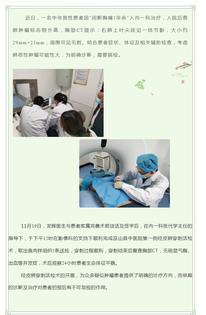 巫山县中医院成功开展第一例CT引导下 经皮肺穿刺活检术